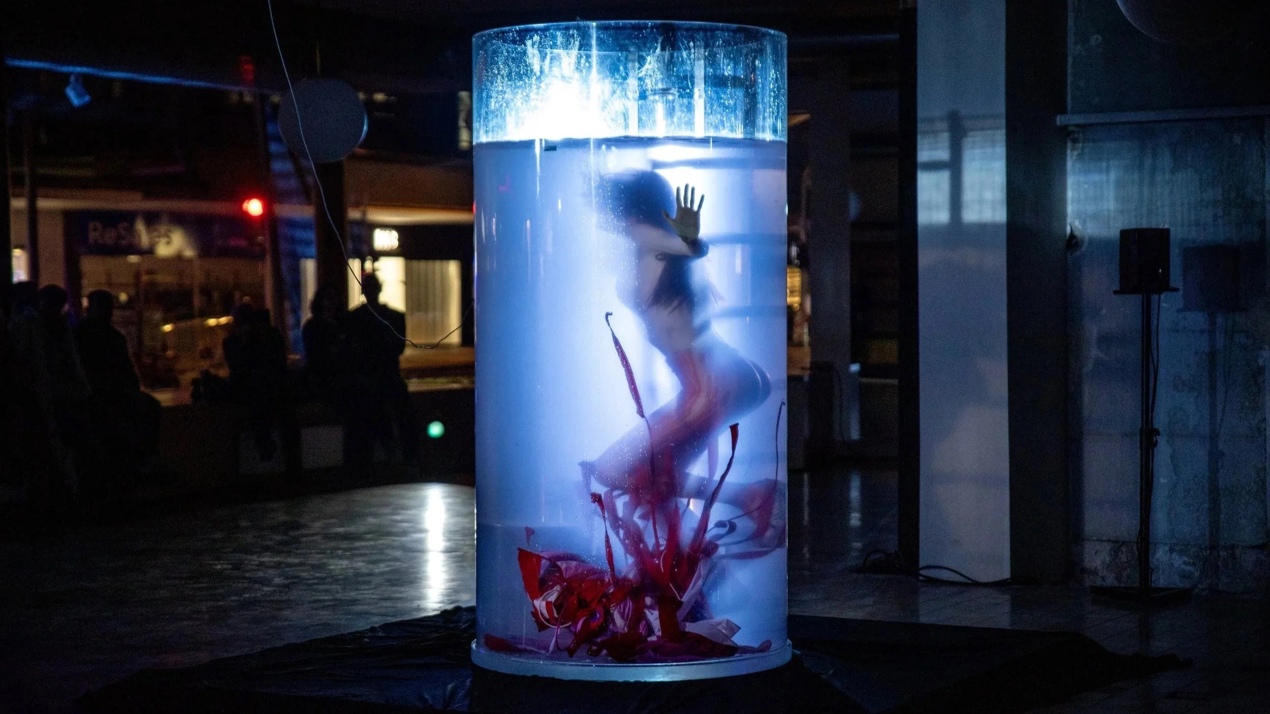 At its center stands a transparent container — 2.1 meters high — that becomes both stage and vessel. Inside, a violin performance unfolds underwater: an act suspended between visibility and opacity, fragility and endurance. Light, sound, and liquid converge, transforming the tank into an axis of reflection, where audiences circle, enveloped by aqueous resonance and shifting projections.